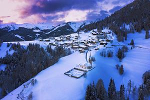 Una vista aerea innevata di Sauris di Sopra in Friuli Venezia Giulia durante un tramonto spettacolare. In primo piano c'รจ l'iconica Chiesa di San Lorenzo di cui trovate un'altra foto in questa gallery. Vi ricordo che 1 inches = 2,54 cm